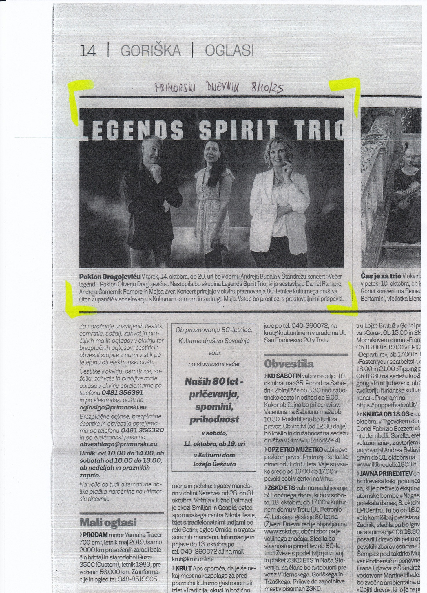 Izbrane objave v tiskanih in digitalnih medijih 2025 Stop 03.01.2025 Štandrež (IT) – 14.10.2025 Štandrež (IT) – 14.10.2025 2024 Stop – 19.12.2024 Slovenske novice 07.03.2024 Zvezde – november 2024 2023 Lady – julij 2022 Nova – april 2022 Nova – april 2022 2021 Nova – oktober 2021 Nova – julij 2021 Žirovske novice – april 2021 (1) Žirovske novice – april 2021 (2) Gorenjski galas – marec 2021 Gorenjski glas – marec 2021 Vklop Stop – februar 2021 (1) Vklop Stop – februar 2021 (2) Dnevnik (Borut Mehle) – februar 2021 Svet 24 – februar 2021 Nova – januar 2021 2020 Nova – oktober 2020 Nova – julij 2020 Nova – april 2020 Nova – februar 2020 (1) Nova – februar 2020 (2) Nova – januar 2020 2019 Nova – september 2019 Nova – september 2019 2018 Svet 24 – marec 2018 2017 Svet 24 – avgust 2017 Gorenjski Glas – julij 2017 Loški utrip – marec 2017 Zvezde – februar 2017 2016 Gorenjski glas – december 2016 Gorenjski glas – november 2016 2015 Svet 24 – december 2015 Gorenjski glas – december 2015 Gorenjski glas – december 2015 Nedeljski – december 2015 2014 Svet 24 – junij 2014 2013 Nedelo – oktober 2013 Gorenjski glas – avgust 2013 Gorenjski glas – maj 2013 2011 Revija Vino – november 2011 Obrazi – oktober 2011 Gorenjski Glas – marec 2011 Nova – januar 2011 Gorenjski glas – januar 2011 2010 Lady – december 2010 Story – november 2010 Lady – julij 2010 Obrazi – junij 2010 Stop – junij 2010 Ločanka – junij 2010 Vikend – junij 2010 Vikend – maj 2010 Ločanka – april 2010 2008 Nedeljski – januar 2008 Izbrane TV oddaje in intervjuji Opis A Kanal - 23.12.2014 Radio Sheefield (Toby Foster, Steve Hawley & Daniel Rampre RTV Slovenija, Dobro jutro / 10. 2. 2017 Radijski intevjuji Opis Intervju - Radio Shefield